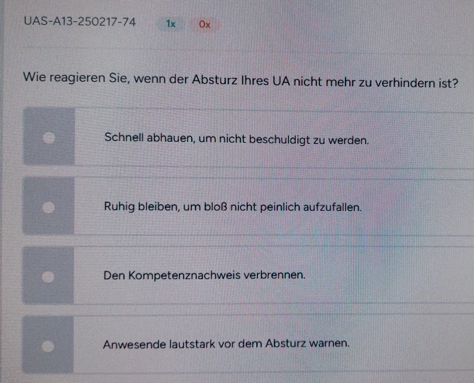 benötigt ihr neben einer Halterhaftpflichtversicherung für Raketenmodelle auch einen gültigen Fernpiloten-Nachweis mit der Fernpiloten-ID und der UAS-Betreiber-Nummer (e-ID)! Wichtig, diese Nachweise haben nur eine Gültigkeit von 5 Jahren und müssen dann durch eine Nachschulung wiederholt und mit einer Prüfung abgeschlossen und nachgewiesen werden! Es ist noch genug Zeit bis zum RJD-2026, deshalb schaut mal rechtzeitig in eure Unterlagen ob ihr noch auf dem aktuellen Stand seit, ansonsten solltet ihr das zeitnah erledigen !Ich habe meine Nachschulung beim Luftfahrt-Bundesamt (LBA) gerade durchgeführt. gefühlt hat der Umfang und die Komplexität gegenüber der Schulung vor 5 Jahren doch um einiges zugenommen, der Zeitaufwand dafür liegt doch bei einem kompletten Nachmittag. Bei der Ausarbeitung der Prüfungsfragen haben die Kollegen vom Luftfahrt-Bundesamt zur Auflockerung der Prüfung, an einigen Stellen aber auch echt mal Humor bewiesen. Am besten gefallen hat mir diese Frage mit 4 Antwortmöglichkeiten.... Den Kompetens-Nachweis verbrennen...