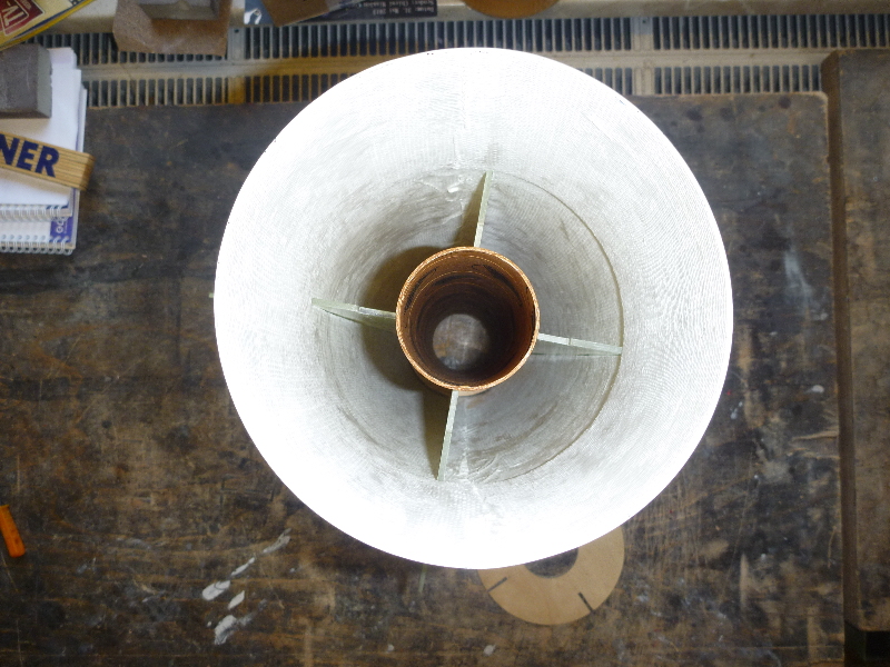 Zwischen Motorrohr und Leitwerk sind Fillets eingebracht, und zur Verstärkung mit 160g Glas laminiert. Endlich gehts mal wieder weiter! Im Augenblick grüble ich über Möglichkeiten einen Klappenmechnismus zu realisieren. Ausserdem möchte ich die noch notwendigen Komponenten (Hauptfallschirmkammer, Elektronik ect.) möglichst weit oben unterbringen. Desto geringer wird das zusätzlich nötige Ausgleichgewicht in der Spitze.
