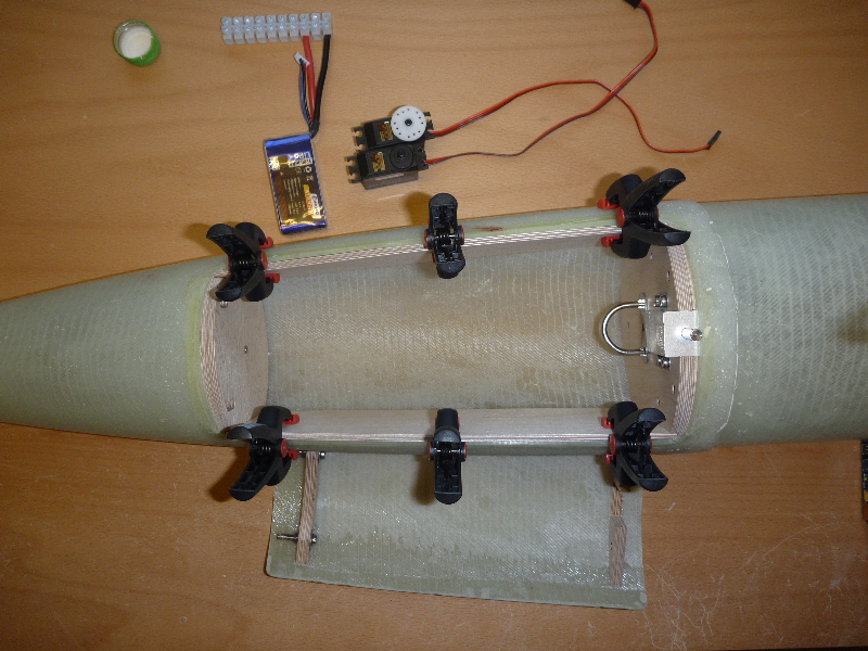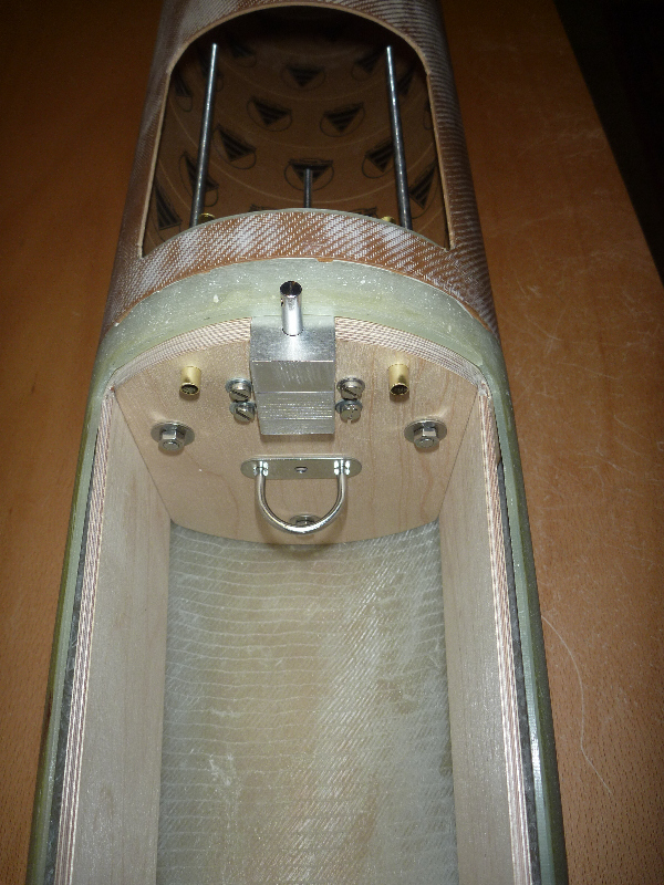 Ich arbeite mich so langsam von Oben nach Unten. Die Gewindestangen sollen den Eröffnungsschock des Hauptschirms in den Rest der Konstruktion einleiten: Die Messingröhrchen dienen später als Führung der Haltebolzen der Hauptfallschirm-Klappe: Viele Grüße Dennis