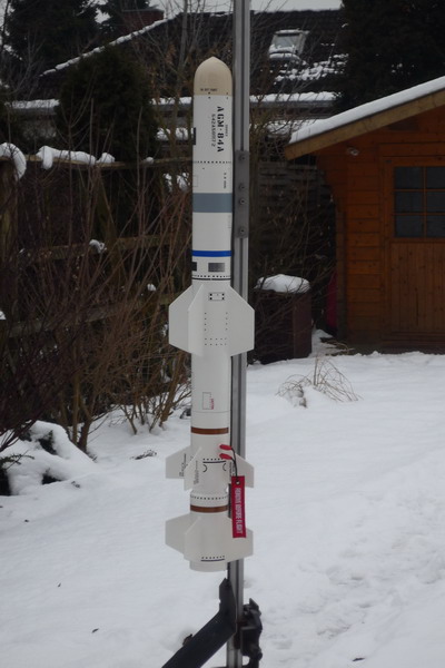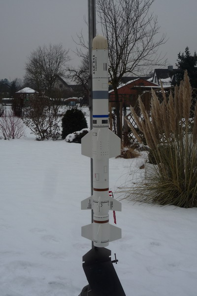 Der Massenschwerpunkt liegt leer am oberen Ende der vorderen Fins.... fertig geladen wird der je nach Motor irgendwo zwischen Mitte der vorderen Fins und dem oberen Railguide liegen. Sieht zumindest nach klassischer Methode betrachtet stabil aus.