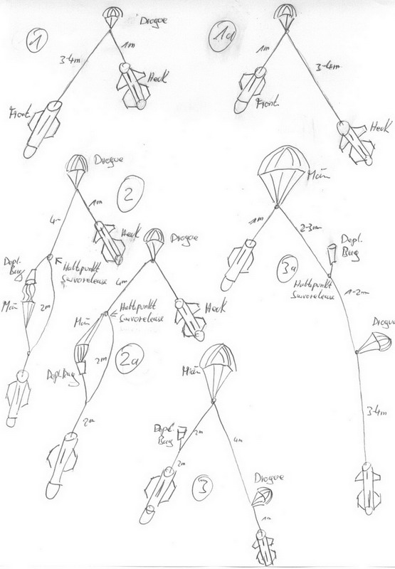 Der Schirm an dem die vordere Sektion landet, ist ein 42" Schirm der in einem 3" DeploymentBag untergebracht ist.