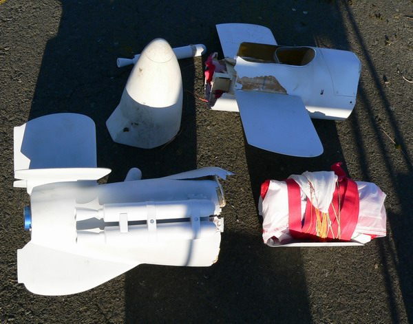 Erstaunlich ist, dass die Flügel und die Spitze, sogar das gesamte Leitwerk nicht abbekommen haben. So gesehen waren es zwei Sollbruchstellen. Na ja, ich gebe es zu, man muß sich so einen Crash doch etwas schön reden. Vielleicht bekomme doch Mut zu einer Reparatur.