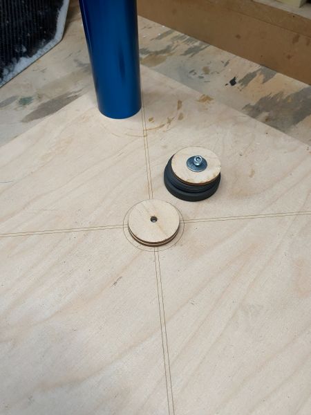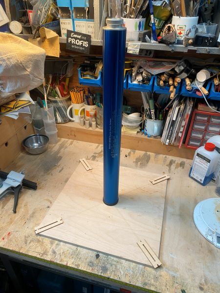 Die Finnen kommen an das Körperrohr und spätestens ab da ist es (die) eine Rakete. Allerdings sind das ja nun nicht irgendwelche flachen Sperrholzfinnen sondern plastische, gewölbte, dreidimensionale, räumliche Hohlkörper oder Formteile oder wie auch immer. Ich will sagen, das Bedarf etwas Vorbereitung. Roman hat zu diesem Zweck eine Lehre konstruiert, die die Finne ausrichtet und fixiert, und diese auf dem 3D Drucker realisiert. Und, er war so nett, mir die Druckdatei zukommen zu lassen. Danke dafür, das Teil ist eine große Hilfe. Nun hab ich mit 3D Druck mal so gar nichts am Hut, aber, wir haben so ein Ding in der Firma stehen!! Also hab ich ganz offiziell bei uns in der F&E vorgesprochen, wurde trotz Begeisterung für die Sache an sich und Begreifens der Dringlichkeit der Sache und des höheren Zweckes, ganz förmlich an die Chefin verwiesen und dort hieß es 7€ (Filament) in die Kaffeekasse oder ein Blech Kuchen für alle. Hab mich für den Kuchen entschieden, und meine Tochter war so nett, die Kollegen mit einer 1A Donauwelle zu beglücken. Das sei hier der Vollständigkeit halber mal erwähnt. Danke Johanna!! Und Schwuppdiwupp hatte ich so ein 1A und einwandfrei 3D gedrucktes Flossenausrichtelehreplastikdingsbums. Als Verbesserungsvorschlag wäre hier eine kleine Kerbe oben auf dem Ring zu nennen, fluchtend mit der Halterung der Finne, um das ganze besser an der Filzstiftlinie auf dem Körperrohr auszurichten. Und der Innendurchmesser ist möglicherweise etwas knapp.... Als weitere Ausrichtehilfe habe ich eine massive Holzplatte auf dem Laser graviert: - ein Kreuz aus einer Doppellinie - exakt in der Mitte eine Bohrung für einen M5 Gewindeeinsatz - gravierte Ringe zum Ausrichten des Rear Closures eines 54mm Motorgehäuses. Auf den exakt mittig verschraubten Verschluss lässt sich dann das Motorgehäuse aufschrauben. Auf den senkrecht und fest stehenden Motor lässt sich der vorbereitete Raketenkörper spielfrei aufsetzen und durch verschiedene Unterlegscheiben aus Sperrholz auf die passende Höhe bringen, da die Finnen ja über das hintere Ende hinausragen. Soweit die Vorbereitungen. Geändert von Kabelmann am 21. Dezember 2025 um 22:40 |