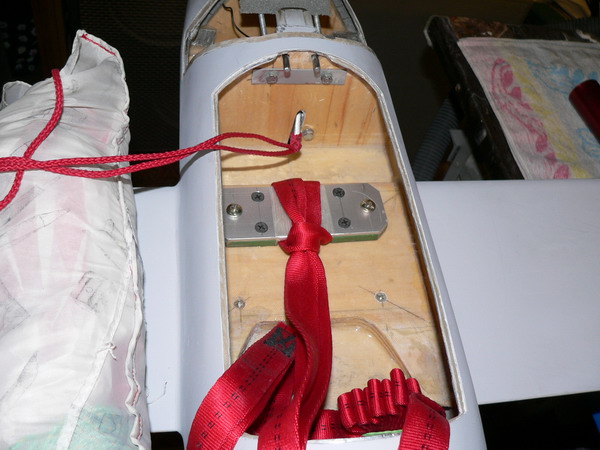 Die rote Schnur ist die Befestigung des Pilotschirms, welcher nach der Freigabe durch den Pyroschalter den Main aus dem Sack zieht.